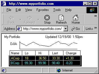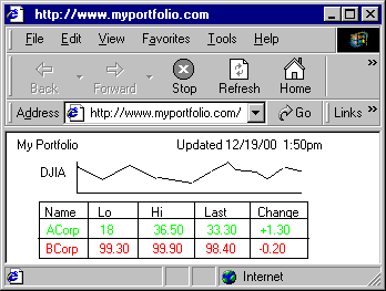 How does it work? PushPage installs in Internet Explorer 5.01 or later. Suppose you have a web page with your stocks on it that looks like this: