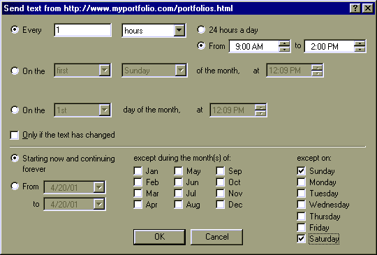 Then you select PushPage from the Tools menu and set the scheduling options. If you want hourly updates and you live on the west coast and you don't want updates until you are awake, you might set the options as follows.